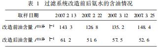 采用微孔陶瓷過濾器進行氨水除油,從2007年2月運行半年以來,取得了很好的效果,為后道工序創(chuàng)造了良好的條件,穩(wěn)定了生化污水的進水水質,提高了污水處理效率。氨水表面看不到有明顯的浮油。蒸氨塔底部排出的焦油量大幅度減少。蒸氨塔塔壓降低,排油管道堵塞次數(shù)明顯減少。經化驗得知,氨水含油量大幅度降低,從以前的140mg/l降低到目前的60mg/l,表1為氨水過濾系統(tǒng)改造前后氨水含油量的對比情況。