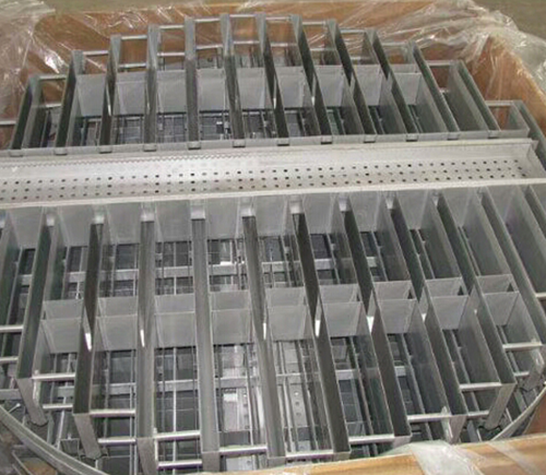 實(shí)現(xiàn)傾斜板對全截面的覆蓋,能夠?qū)σ后w收集時提升收集效率,這是柵板式支承-收集-再分布器的最Z大優(yōu)點(diǎn),但是對于上升氣流的干擾以及高度的增加,會導(dǎo)致其性能受到一定程度的影響。因此,應(yīng)該采用合理的方式對柵板式支承-收集-再分布器進(jìn)行改進(jìn)。柵板支承絲網(wǎng)填料的過程中,液體受到上升氣流的影響,會通過塔壁四周流下。這是由于在網(wǎng)片中存在一定程度的毛細(xì)作用,加上上升氣流的上舉力作用,導(dǎo)致液體下落有在困難。為了有效對液體進(jìn)行收集,需要采取合理的導(dǎo)流措施。為了便于液體分散落入分布槽中,可以將柵板下緣設(shè)計(jì)為鋸齒狀。液體沿內(nèi)壁流下后通過集液環(huán)由環(huán)形槽收集。多孔型和溢流型柵板式支承-收集-再分布器的設(shè)計(jì),能夠分別在小流量和大流量操作中提升工作效率。